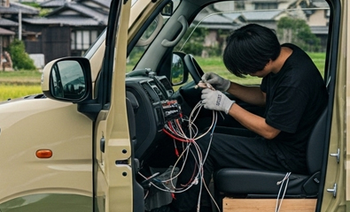 走行充電システムやリチウムバッテリー、インバーター、ソーラーパネル、FFヒーターなど、快適な車中泊や長旅を支える電装修理・カスタマイズに幅広く対応。